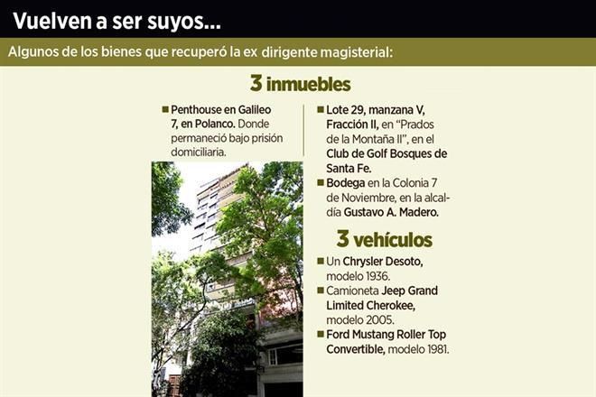 "Actualmente no existe ningún asunto activo en contra de la maestra ni posibilidad del ejercicio de la acción penal, razón por la cual se trata de un asunto totalmente concluido y, por tanto, la maestra ya no enfrenta ninguna acusación penal". En cuanto a los inmuebles en su momento intervenidos ministerialmente, uno es el departamento de Galileo 7, en Polanco, donde estuvo confinada bajo el beneficio de la prisión domiciliaria. La FGR también le devolvió el menaje y las obras de arte que estaban en su interior, las cuales no se precisan. Estas últimas son ajenas a las 17 obras que el Sindicato Nacional de Trabajadores de la Educación (SNTE) anunció que también le fueron devueltas por la SEIDO el 29 de junio de 2018. El único bien que a la fecha continúa asegurado por la FGR es el avión Cessna Citation Encore, modelo 560, en el que regularmente se transportaba Gordillo, previo a su captura en 2013. Sin embargo, su abogado precisó que esta aeronave es propiedad de Comercializadora GC, S.A. de C.V. y que la maestra no tiene relación con la misma y tampoco es parte del litigio que ha sido entablado por la empresa para levantar el aseguramiento. Los aseguramientos levantados corresponden a dos averiguaciones previas en contra de Gordillo por lavado de dinero y defraudación fiscal que instruyó la Unidad Especializada en Investigación de Operaciones con Recursos de Procedencia Ilícita, Falsificación o Alteración de Moneda de la SEIDO. -- REFORMA