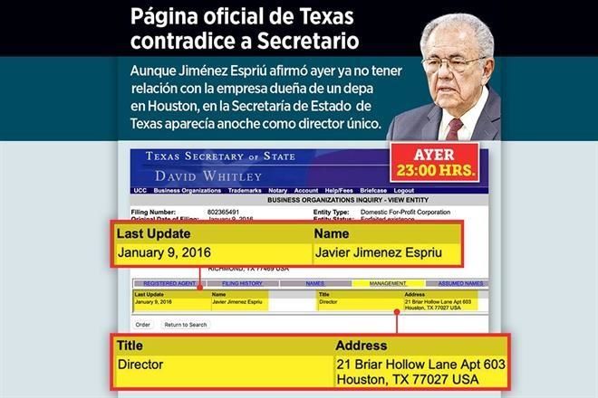 Sin mostrar documento alguno, el Secretario de Comunicaciones y Transportes, Javier Jiménez Espriú, aseguró ayer por la mañana haber cedido a su hijo las acciones de la compañía Houston Relais Real Estate Inc. propietaria de un departamento de 6.6 millones de pesos en Houston. Sin embargo, al consultar anoche el registro de compañías de Texas, en éste aparece Javier Jiménez Espriú como administrador único de la compañía. Grupo REFORMA publicó ayer que el funcionario del Gabinete de Andrés Manuel López Obrador omitió informar en su declaración patrimonial del 26 de diciembre pasado ser propietario del departamento 603 de la torre Briar Place en Houston, valuado en 346 mil dólares, unos 6.6 millones de pesos. Jiménez Espriú adquirió el departamento el 29 de febrero de 2016 a través de la empresa que él mismo creó el 9 de enero de ese año. Ayer, a traves de Twitter, el titular de la SCT dijo que no declaró el condominio ni la empresa porque ya no está vinculado a ellas. "De manera previa a mi regreso como funcionario público", expresa el Secretario en el texto, "las acciones de esa sociedad, que se encontraban a mi nombre, pasaron a la titularidad de mi hijo Javier Jiménez Gutiérrez. Pero al consultar anoche el registro de compañías -en el sitio de la Secretaría de Estado de Texas-, la administración interna de Houston Relais Real Estate Inc., permanece sin cambios desde el 9 de enero del 2016, cuando el hoy Secretario Jiménez Espriú organizó la empresa. --