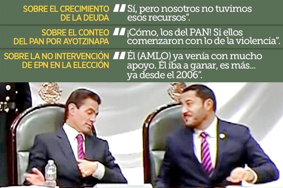 Era el 1 de diciembre y Enrique Peña Nieto acababa de entregar la banda presidencial, y en tribuna hablaba Andrés Manuel López Obrador El nuevo Presidente condenaba el crecimiento de la deuda pública durante los últimos tres sexenios, a pesar de los ingresos petroleros. "Sí, pero nosotros no tuvimos esos recursos", comentó Peña al presidente del Senado, Martí Batres. "Y le di la razón porque si bien la deuda creció en el sexenio de Peña Nieto, también es cierto que coincidió con una baja en los ingresos del petróleo", contó Batres. Cuando legisladores panistas se pusieron de pie para condenar la desaparición de los normalistas de Ayotzinapa, Peña tampoco se quedó callado. "¡Cómo los del PAN!, si ellos comenzaron con lo de la violencia. ¿Ellos contando del 1 al 43? Si ellos son los que empezaron", dijo Peña Nieto, según Batres. El senador recuerda el tercer comentario que le hizo Peña cuando López Obrador le reconoció que no intervino en los procesos electorales. "Y me dice 'bueno, de todas maneras él ya venía con mucho apoyo, él iba a ganar, es más... ya desde 2006'". -- Reforma