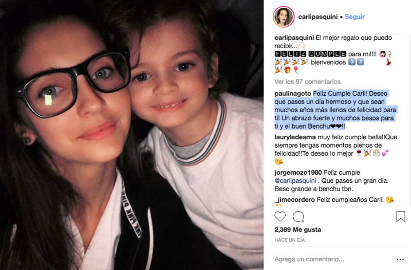 Demostrando que no hay ningún tipo de diferencia entre ella y Carla Pasquini, mamá del hijo del actor, Paulina posteó una cariñosa felicitación de cumpleaños que fue amablemente correspondida. “¡Feliz Cumple Carli! ¡Deseo que pases un día hermoso y que sean muchos años más llenos de felicidad para ti! ¡¡Un abrazo fuerte y muchos besos para ti y el buen Benchu❤❤!!”, posteó Paulina en Instagram.