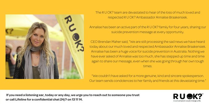 La modelo era embajadora del grupo de prevención del suicidio R U OK? que ayuda a las personas a combatir los problemas en su vida.