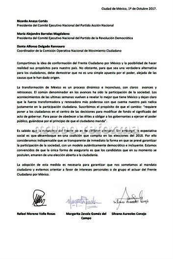 Los panistas Rafael Moreno Valle y Margarita Zavala y el perredista Silvano Aureoles pidieron a sus dirigencias nacionales que la definición del candidato que postule el Frente Ciudadano por México surja de una elección abierta a la ciudadanía. "Consideramos indispensable que se transparente de inmediato la forma en que se prevé garantizar la participación de la sociedad, con un modelo auténticamente democrático e incluyente. Estamos convencidos de que la única forma de asegurarlo es que los candidatos que en su momento se postulen, emanen de una elección abierta a la ciudadanía", señalaron en una carta enviada a los líderes del PAN, PRD y Movimiento Ciudadano. Los tres aspirantes a la candidatura Presidencial destacaron que esto evitará orientar a favor de intereses personales o de grupo, el actuar del Frente Ciudadano. Además, señalan que el Frente debe demostrar que se busca una alternativa para los ciudadanos, y no es una apuesta por el poder. "Los acontecimientos de las últimas semanas vuelven a revelar lo mejor que tiene México y dejan claro que la fuerza transformadora y renovadora más poderosa con que cuenta nuestro país radica justamente en la participación ciudadana", se establece en la misiva con fecha de 1 de octubre y firmada por Moreno, Zavala y Aureoles. -- REFORMA