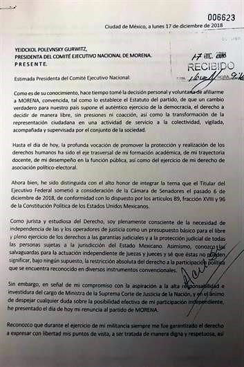 Loretta Ortiz, propuesta por Andrés Manuel López Obrador en la terna para ocupar el cargo de ministro en la Suprema Corte de Justicia de la Nación (SCJN), presentó su renuncia a Morena. Horas antes de comparecer ante senadores, la candidata a ocupar la vacante del ex Ministro José Ramón Cossío en la Corte, notificó de su decisión a la dirigente de Morena, Yeidckol Polevnsky, a través de una carta. "En señal de mi compromiso con la aspiración a la alta responsabilidad e investidura del cargo de Ministra de la Suprema Corte de Justicia de la Nación, y en el ánimo de despejar cualquier duda sobre la posibilidad efectiva de mi participación independiente, he presentado el día de hoy mi renuncia al partido de Morena", dice la misiva con fecha 17 de diciembre. Asimismo, señaló que decidió renunciar al ser consciente de la independencia que requieren los operadores de justicia. "Como jurista y estudiosa del Derecho soy plenamente consciente de la necesidad de independencia de las y los operadores de justicia como presupuesto básico para el libre y pleno ejercicio de los derechos a las garantías judiciales y a la protección judicial de todas las personas sujetas a la jurisdicción del Estado Mexicano, escribió. "Asimismo, conozco las salvaguardas paa la actuación independiente de juezas y jueces y sé que éstas no pueden significar, bajo ningún supuesto la restricción absoluta del derecho a la participación política que se encuentra reconocido en diversos instrumentos convencionales". Loretta Ortiz fue diputada federal por Morena de 2012 a 2015. La abogada será la tercera y última aspirante que comparezca este lunes ante senadores.